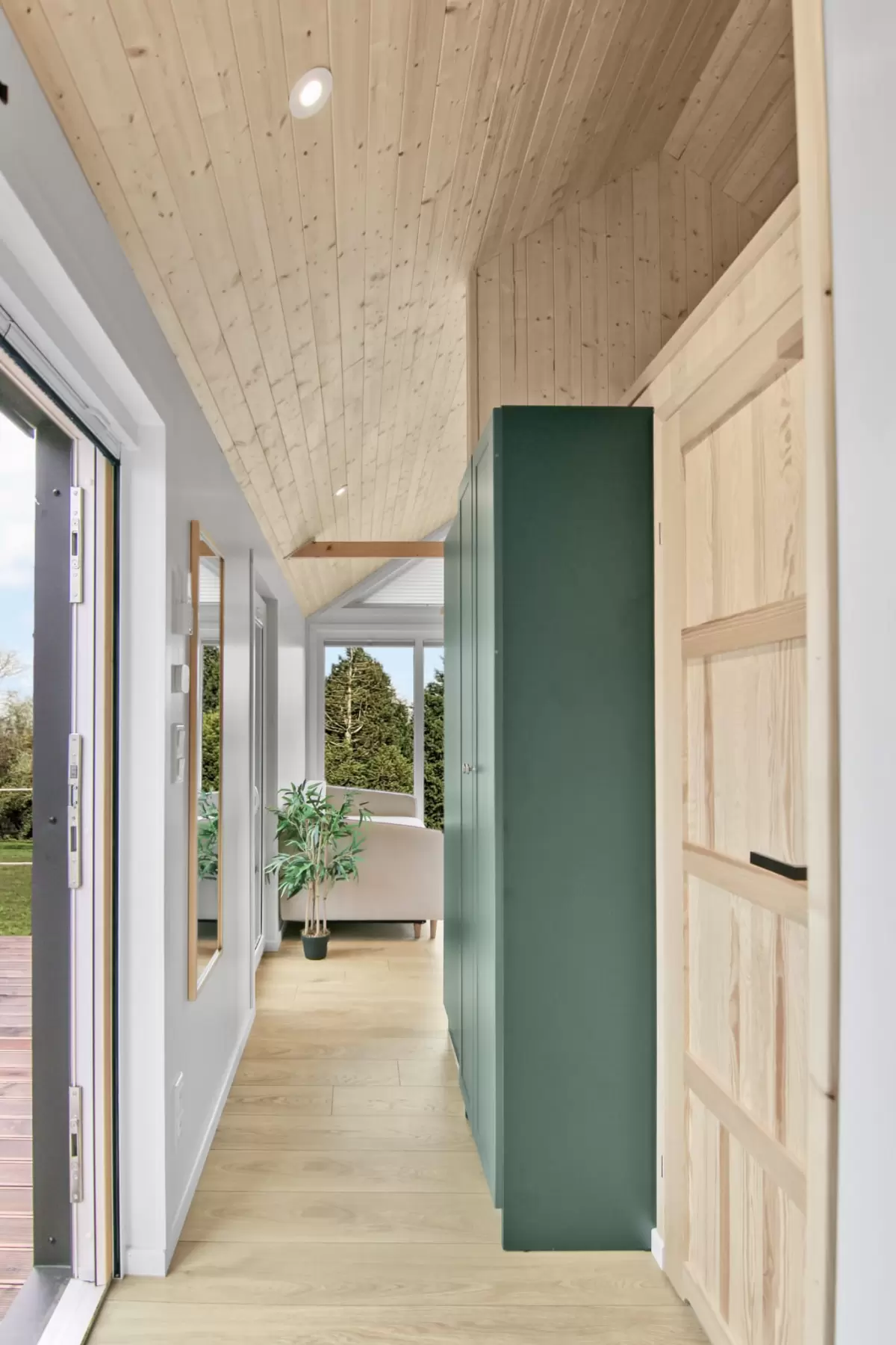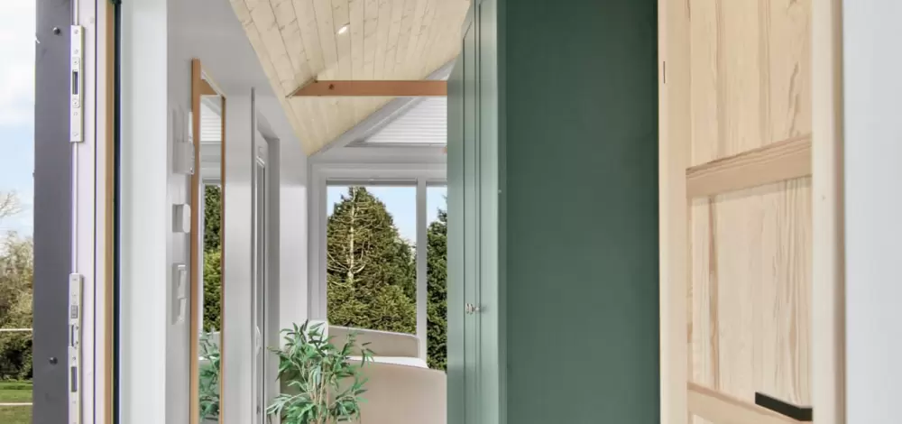 Die grossen Fenster schaffen helle Innenräume und holen die Natur ins Haus. Die durchdachte Raumaufteilung sorgt für Privatsphäre, Funktionalität und Offenheit zugleich. Direkt gegenüber dem Eingang befindet sich ein clever genutzter Stauraum im Dachbereich – ideal für saisonale Dinge oder selten genutzte Gegenstände.