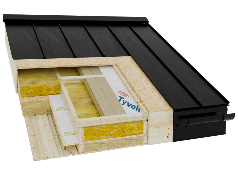 Unsere Wände bestehen aus einem robusten Holzrahmen mit Mehrfachdämmung (Mineralwolle + Holzfaserplatte), intelligenter Dampfbremse (INTELLO PLUS), winddichter Tyvek-Folie und einer dekorativen Aussenverkleidung.