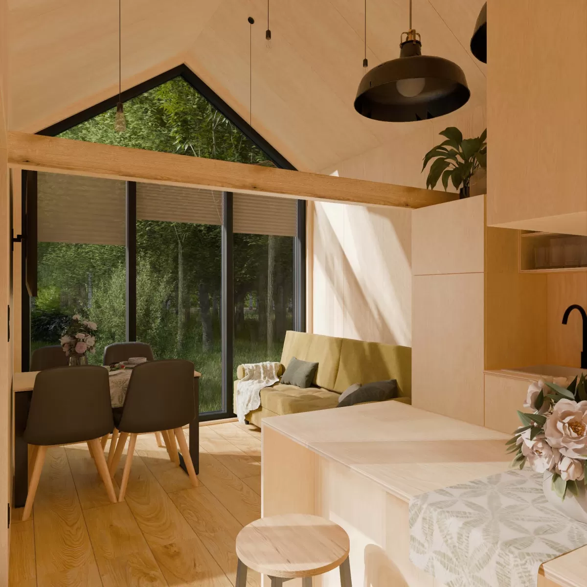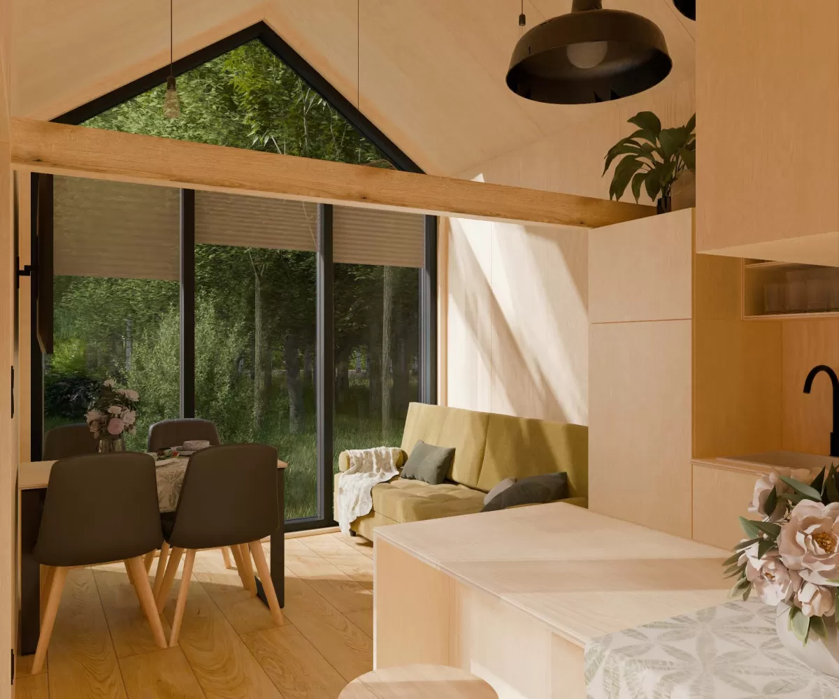 Zenith ist ein modernes Tiny House im Scheunenstil – eine erweiterte Version des Modells SKY mit zusätzlichem Zwischengeschoss/Loft. Im Erdgeschoss bietet das Haus ein grosszügiges Wohnzimmer, eine Küche mit Kochinsel, ein grosses Schlafzimmer, ein Badezimmer sowie einen Technikraum, der auch als Abstellraum oder Speisekammer genutzt werden kann.